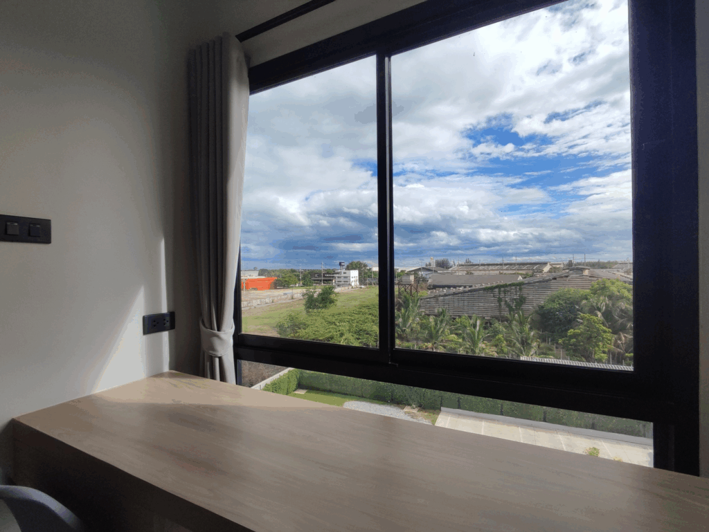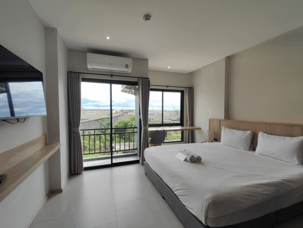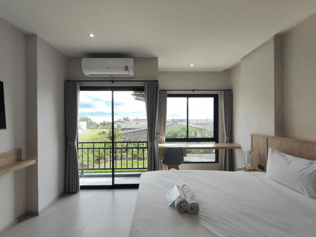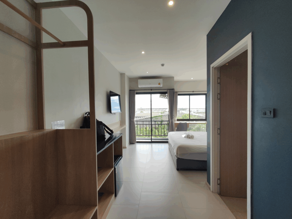 The Way Hotel Ban Pong โรงแรม เดอะ เวย์ บ้านโป่ง โรงแรมที่พัก ในอำเภอบ้านโป่ง จังหวัดราชบุรี ห้องพักสะอาด นอนสบาย แบ่งสัดส่วนได้ดี มีโซนตู้เสื้อผ้า เตียงนอน และ โต๊ะนั่งเล่นริมหน้าต่าง แอร์เย็นฉ่ำ มีระเบียงเล็กๆ มี Smart TV ชม Youtube / Netflix ได้ มี Wifi ห้องน้ำกว้าง สะอาด มีเครื่องทำน้ำอุ่น บริเวณชั้น1 มี Coffee break ชา กาแฟ ขนม ฟรี 24 ชั่วโมง มีฟิตเนส ทั้ง Weight และ Cardio ที่จอดรถกว้างขวาง มีรปภ.ดูแล 24 ชั่วโมง